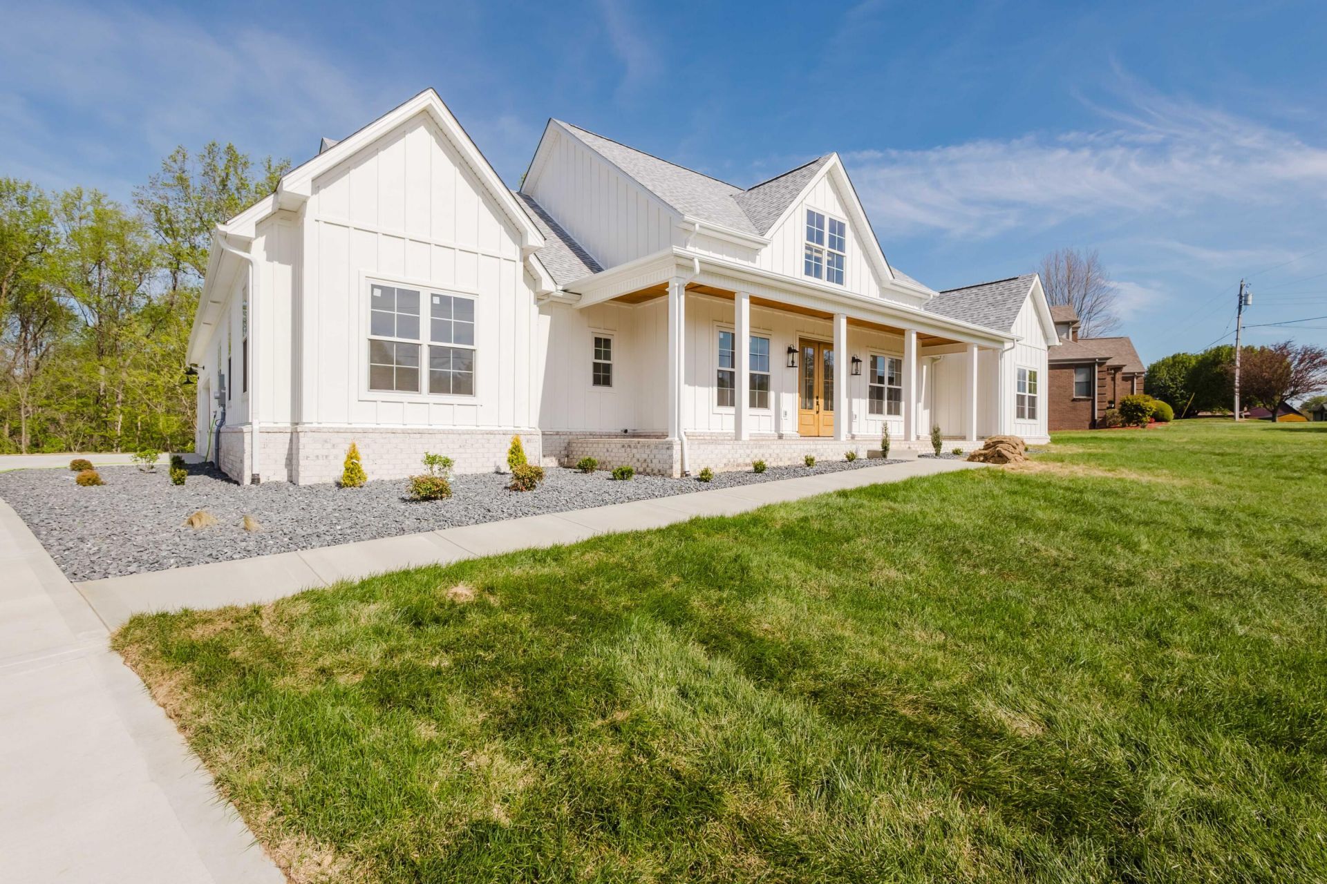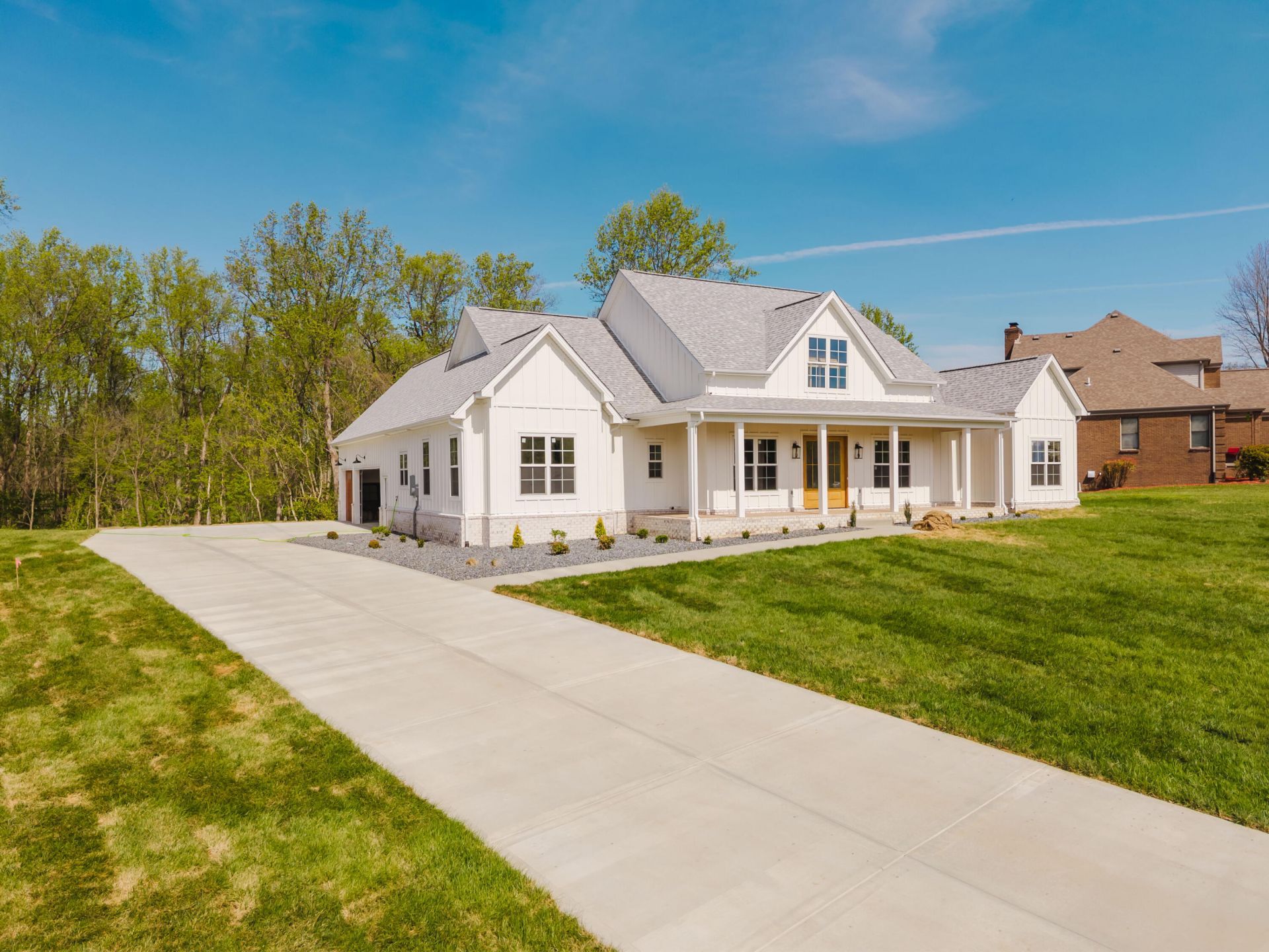 Positioned on a beautiful 1.55-acre lot in Northern Madison County, this nearly completed modern farmhouse offers the perfect blend of privacy, design, and functionality (just 30 days from completion). Backing to a wooded tree line, on a dead end street, the setting delivers a peaceful, secluded feel while still being minutes from Richmond conveniences. This thoughtfully designed home features nearly 2,400 sq ft of living space with a highly desirable split-bedroom layout, offering 4 bedrooms, 3.5 baths, and exceptional everyday livability with maximum privacy. From the moment you arrive, you'll be drawn in by the striking curb appeal that is highlighted by classic white board-and-batten Hardie board siding, multiple gables, and a large welcoming covered front porch that creates a clean, balanced farmhouse aesthetic. Inside, the home opens to a stunning vaulted great room with a shiplap ceiling, custom wooden beams, a large chandelier, fireplace, and built-ins, flowing seamlessly into a picture perfect and spacious kitchen with custom soft close cabinetry as well as high end countertops, designed for both entertaining and daily life. The kitchen features a large island with seating, a walk-in pantry, and easy access to a rear covered porch that is perfect for indoor-outdoor living. The primary suite is privately positioned and offers a true retreat with vaulted ceilings, a luxurious en-suite bath, a generous walk-in tiled shower, double vanities, soaking tub, and large walk in closet. On the opposite side of the home, three additional bedrooms provide flexibility, including a Jack-and-Jill bath and a private guest suite setup.Additional highlights include a dedicated dining space or home office, a functional mudroom, main-level laundry, and a spacious side-entry 3-car garage. Enjoy evenings overlooking the private wooded backdrop from the expansive rear porch, creating the ideal setting for relaxing or entertaining. A rare opportunity to own a brand-new construction home on acreage with high-end design, privacy, and convenience will be ready very soon. Schedule your showing now and secure it before completion.